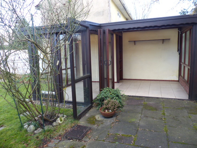 Eine Terrasse und ein Wintergarten laden dazu ein, den idyllischen, blickdichten Garten mit urigem alten Baumbestand, Sträuchern und Blumen zu genießen und bietet Möglichkeiten für Entspannung und Erholung oder gesellige Stunden im Freien.