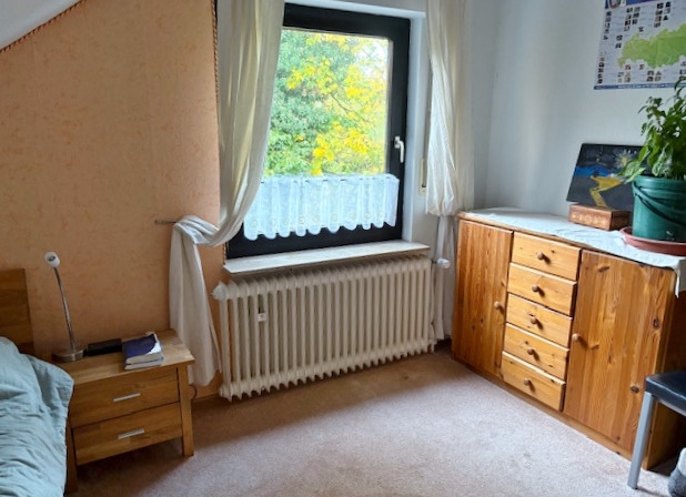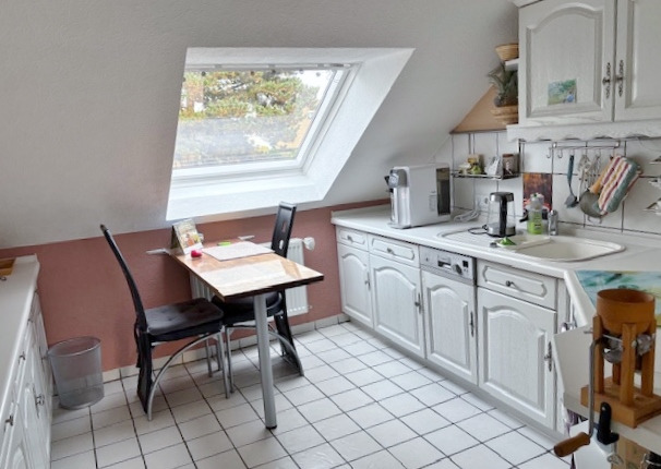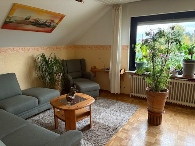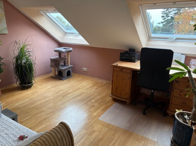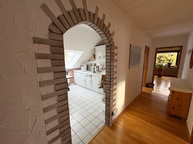 Über das Treppenhaus mit Marmorfußboden erreichen Sie die gemütliche Wohnung im gesamten Dachgeschoss mit etwa 66 m² Wohnfläche. Hier sind ein Wohnzimmer, ein Schlafzimmer mit einem abgetrennten, kleinen Büro, Küche, Bad und Flur untergebracht. Die Wohnung ist derzeit gut vermietet und hilft, die monatliche Finanzierungsrate zu senken. Nach Vereinbarung kann die Wohnung etwas später auch eigengenutzt werden. Der Mietwohnung zugeordnet ist ein überdachter Freisitz im hinteren Garten, ein PKW-Stellplatz und ein Kellerraum.