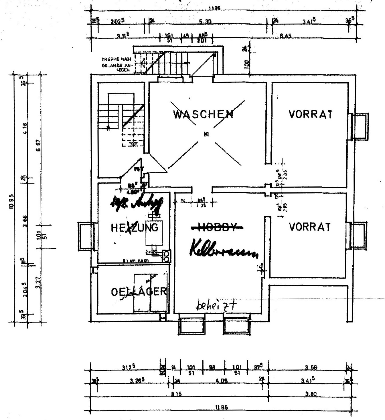 Das Kellergeschoss verfügt über einen Waschkeller mit Außentreppe zum Garten, 2 Kellerräume, 1 beheizbaren Hobbyraum und den Heizungsraum mit Öltanklager.